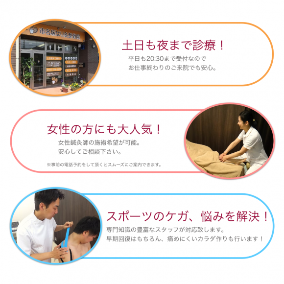 スポーツ障害のケアを得意としており、捻挫や肉離れ、オーバーユースによる痛みなど、早期回復をサポートする環境を整えています。部活帰りの学生さんやお仕事帰りの方でも通いやすいよう、平日はもちろん土日も診療し、夜は20:30まで受付しています。(日曜のみ19:30まで)